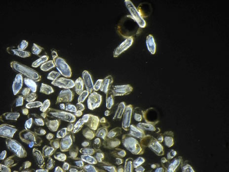 Two photos of separated zircons provided by UNAM, Juriquilla, Queretaro, Mexico. Sample provided by Dr. Luigi Solari, UNAM, Queretaro, Mexico.