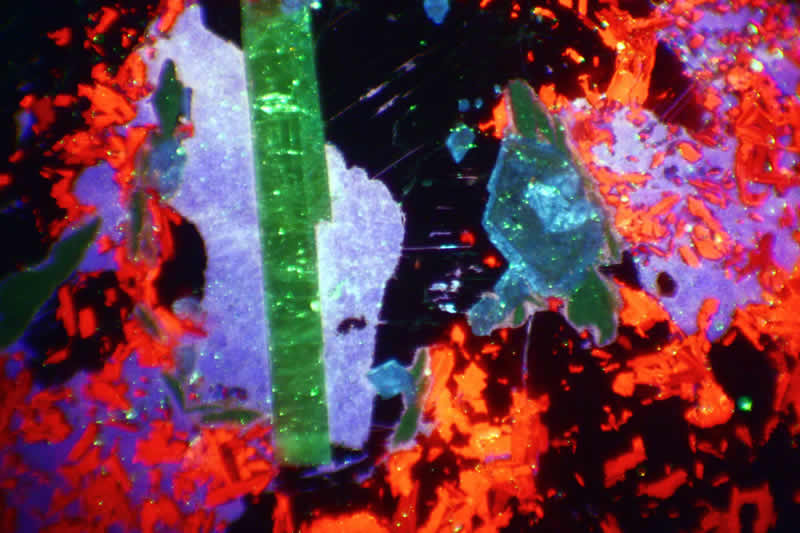 This is a Cathodoluminescence micrograph of Sm3+ - activated apatite (light pink) in a dolomite carbonatite matrix (field of view = 2.5 mm).