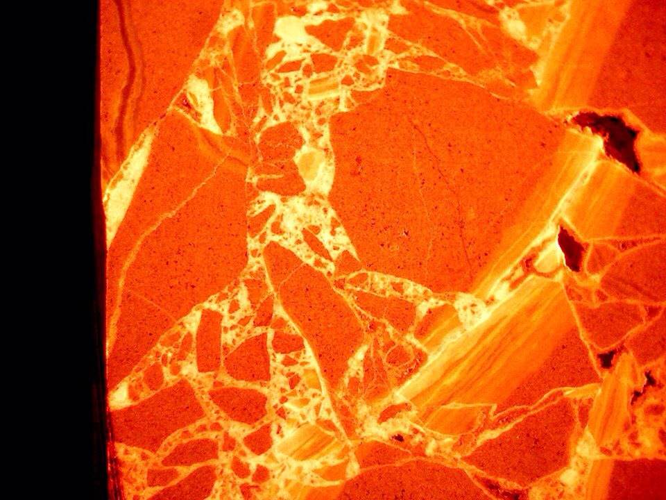 Mud stone from along the San Andreas fault zone showing calcite filled fractures. Magnification 10X. Photo provided by Felix Desperrier, Sonoma State University, CA.