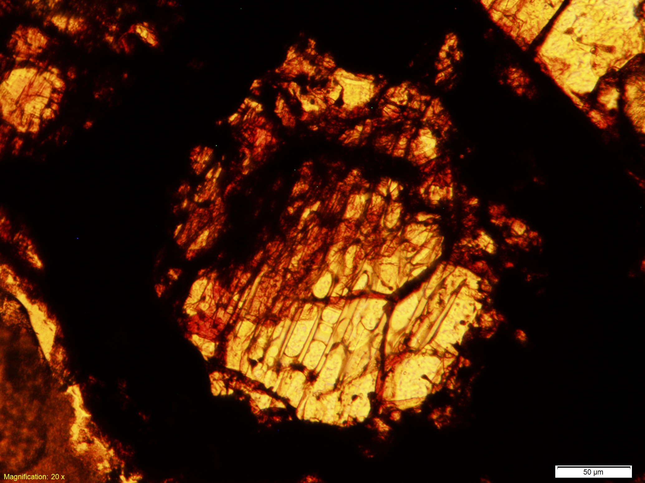 2. We also see the chondrule, which should be spherical (circular in cross-section) has an igneous rim that gives it a slightly different outline. The rim is not zoned like the crystals that make up the barred olivine chondrule. This rim also appears to be composed of 2 different MgO contents of olivine as well.